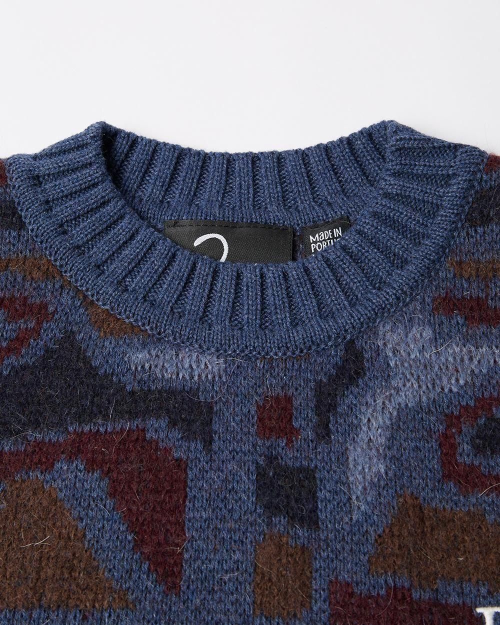 "REPEAT FTP"のアートワークを全面にあしらったニットプルオーバー。胸元にWeird tradロゴの刺繍を施しています。