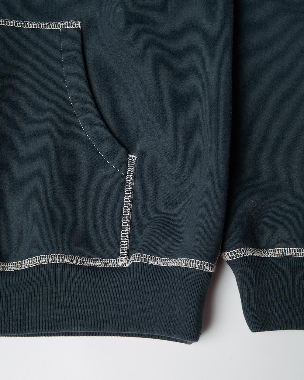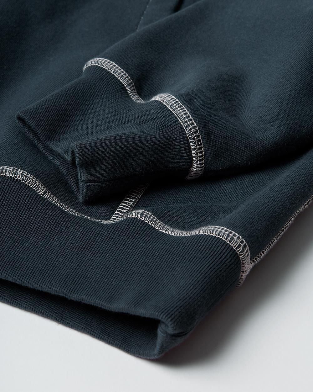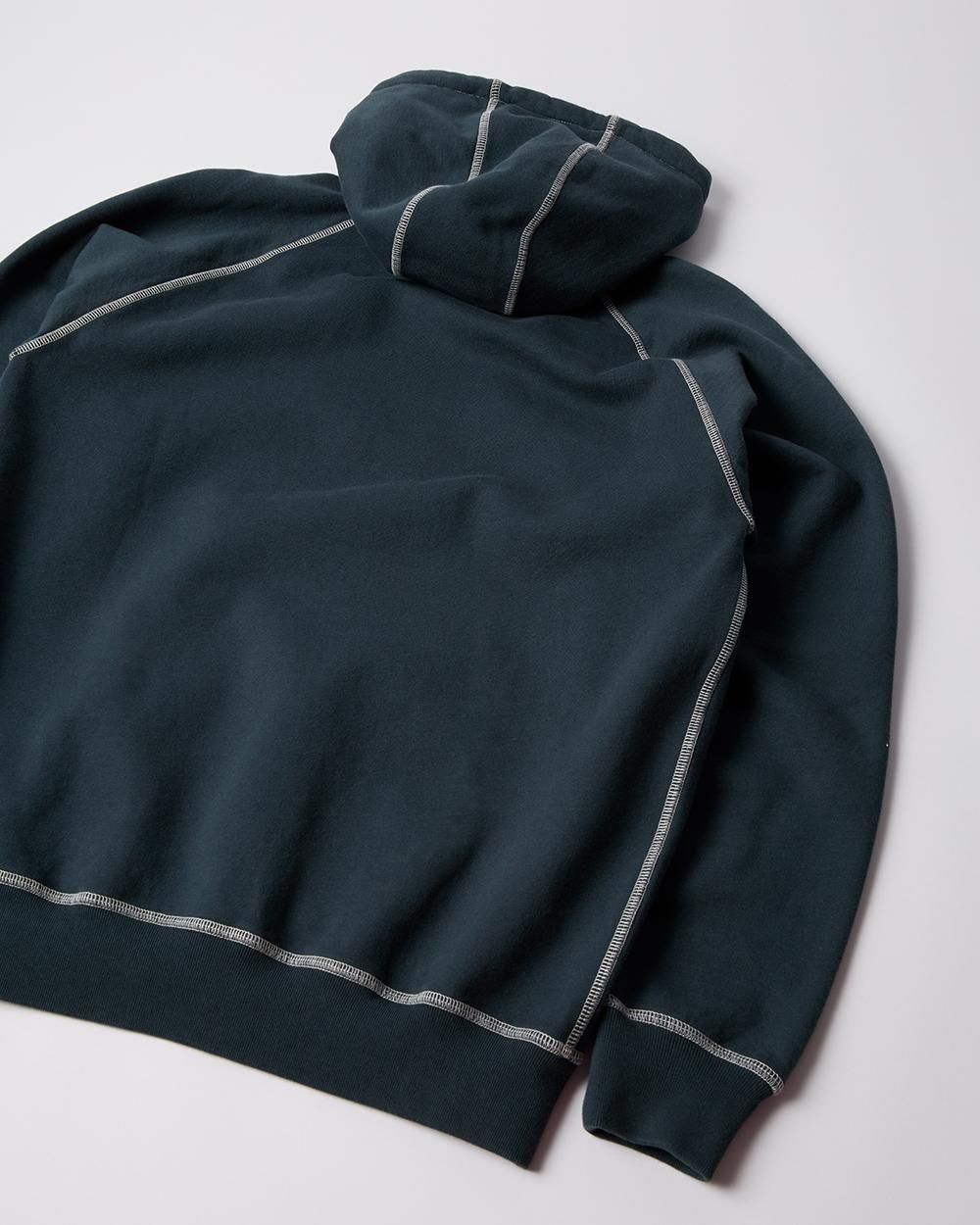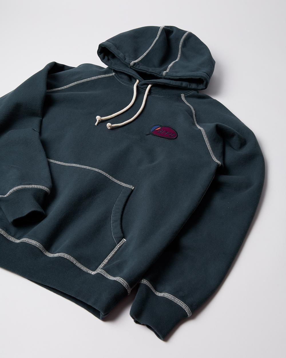 胸元にCircled scriptロゴを刺繍で施したフーディー。コントラストカラーのオーバーロックステッチが特徴です。